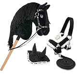 - UN ENSEMBLE DE HOBBY HORSING COMPLET ET RÉALISTE Black Star, ton hobby horse frison, est livré avec un équipement complet, comprenant un filet avec des rênes amovibles et un frontal incurvé qui lui donne un style encore plus proche de celui des vrais chevaux. Un licol noir doublé d'une moumoute blanche complète la panoplie de ton hobby horse. Tu pourras utiliser ce licol avant ou pendant les exercices avec ton hobby horse. Une longe noir assortie est livrée avec le licol pour plus de réalisme et d'activités ludiques. Elle te permettra d'attacher ton hobby horse pendant que tu t'occupes de lui. Un bonnet anti-insectes noir bordé de blanc apportent une touche raffinée à ton hobby horse.