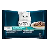 - Purina 4 x 85 g poisson de l'océan, carrelet, thon et saumon. Gourmet, perle, les plaisirs de la mer, au poisson de l'océan avec des crevettes entières, au carrelet avec des crevettes entières, au saumon avec des crevettes entières et au thon avec des crevettes entières. Aliment complet pour chat adulte.